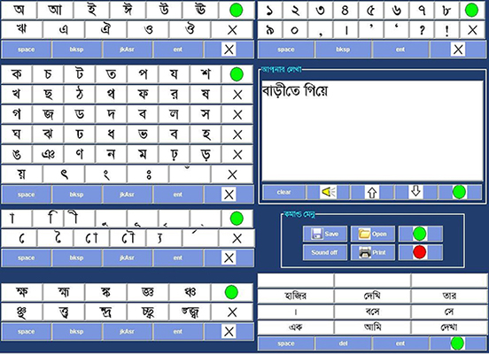 The speech enabled keyboard allows a sightless user to type texts through normal English QWERTY or Bengali “Baishakhi” keyboard and obtain speech feedback at the character, word or sentence level.