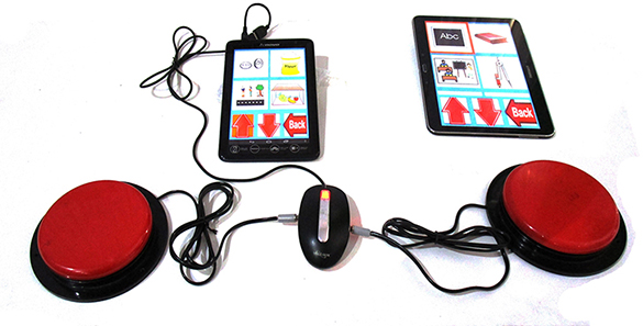 Switch Mode: This version allows the user to communicate with two bright red switches. “By pressing the first switch, an icon gets selected (for instance, two girls crossing a road) and on pressing the second one its message (be careful while crossing) becomes audible.