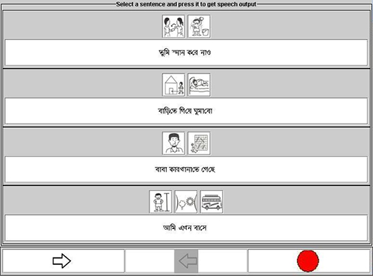 In the stored message mode, a set of pre-stored messages is kept in the system. Each of these messages is accompanied by one/more images. The interface component shows these messages to the user and the user communicates by selecting one/more of these messages. This mode is also speech enabled.